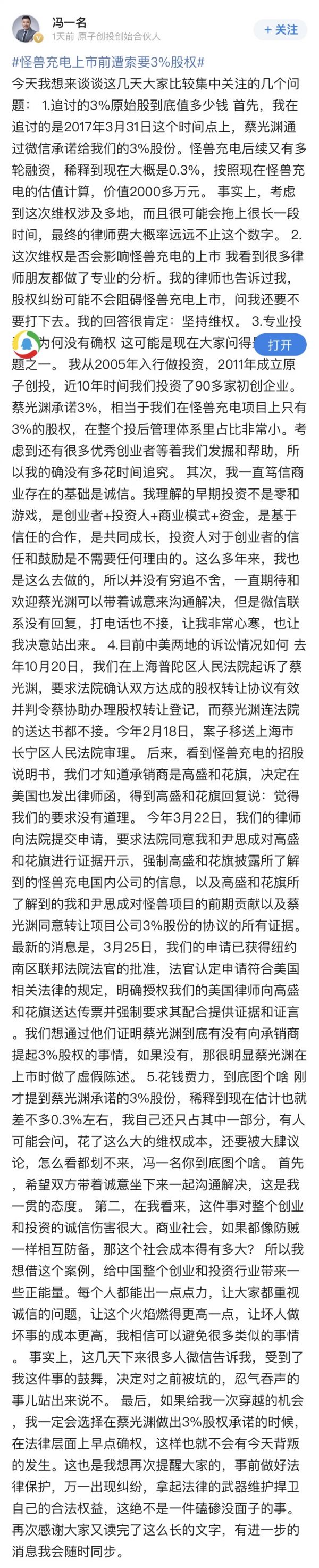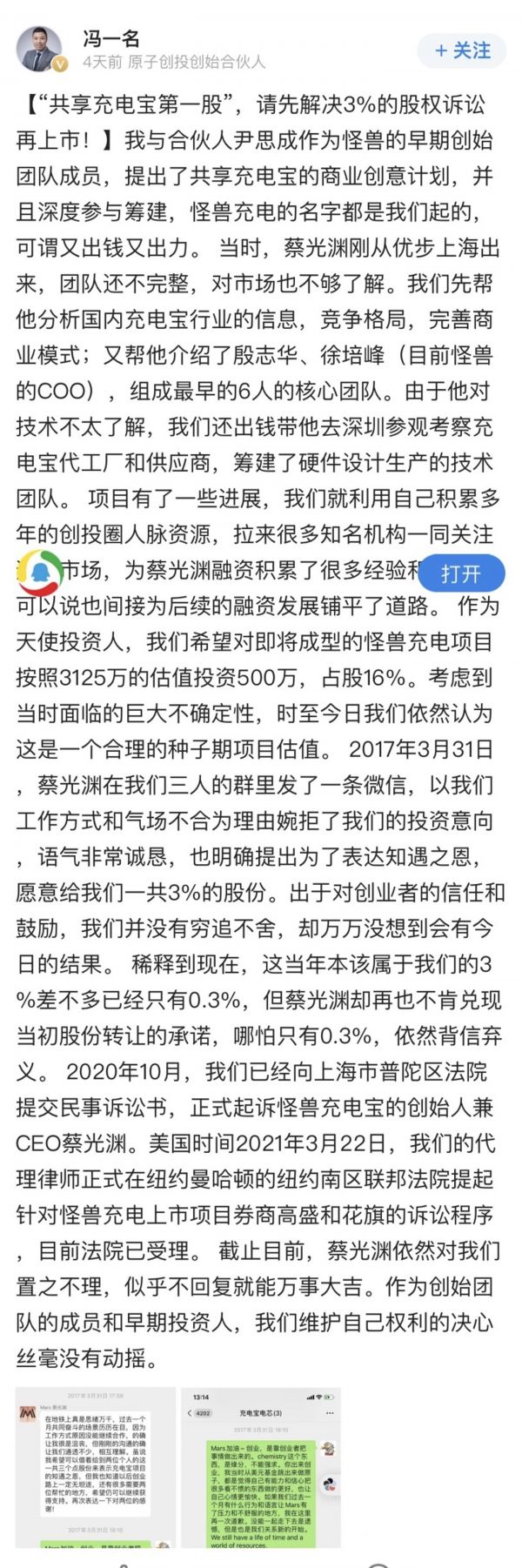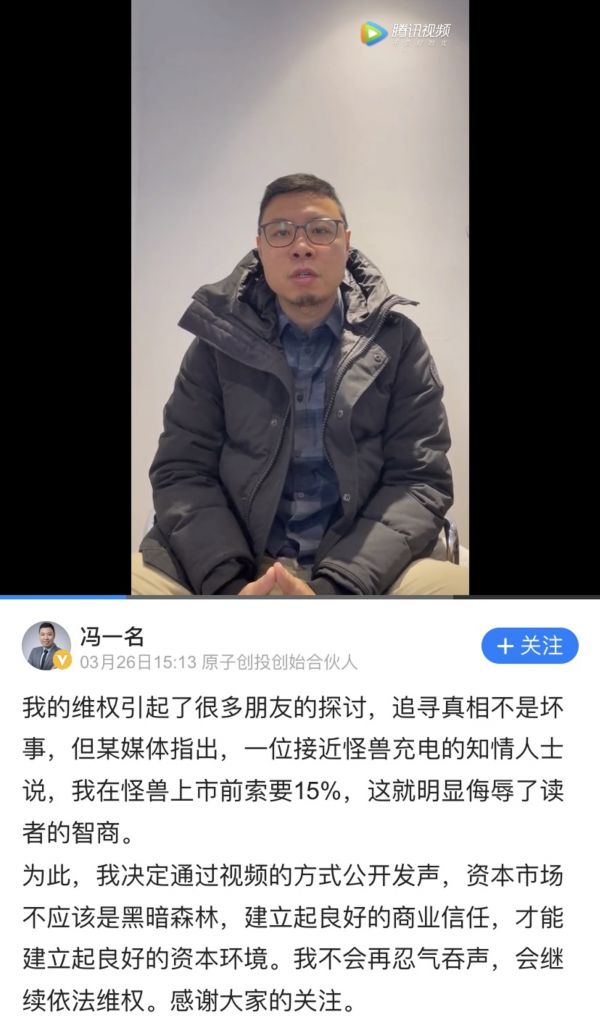 3月26日,冯一名在腾讯新闻话题栏目再次发文,否认某“知情人士”对其在怪兽充电上市前曾索要15%的股份的污蔑,并称其在此前接受的专访所言全部有事实根据。