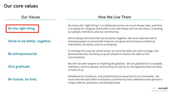 目前,WeWork价值观的第一条是“做正确的事”。