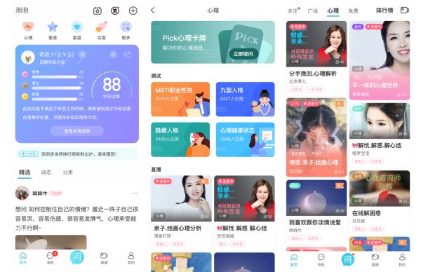 工具属性的“测试”:一方面包括MBTI、九型人格、隐藏人格等测试和独家研发的Pick心理卡牌、同时也包括星座、塔罗等工具,能够测性格、测关系等; UGC内容社区:聚集了一批对心理、星座、情感话题感兴趣、想发言的用户; 直播连麦在线咨询:帮助用户实时解答困惑。目前测测签约了 1 万+ 咨询师,大部分经过了心理咨询方面的培训。
