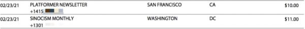 支付给Platformer和Sinocism的信用卡对账单(非Substack上的)