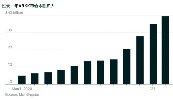 这可能意味着今年ARKK的表现将更像2019年,而不是2020年。阿诺特说,“ARKK仍是一只非常激进的成长型基金,但当一只基金的资产规模不断扩大时,要维持业绩优势可能会更加困难。”