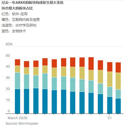 ARKK关注的板块也发生了变化。2020年3月,生物技术和诊疗法板块占比最大,分别占投资组合的22%和15%。到今年2月底,生物技术仅占14%,诊疗法占8%。