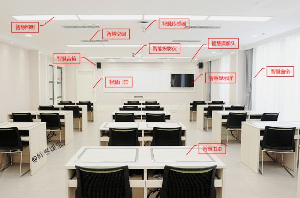 教室的黑板,逐渐变成电子白板,可以通过触摸等方式进行演示;教室的空调、照明、窗帘,可以通过温湿度传感器进行自动调节;教室的烟雾传感器,可以在发生火灾时及时报警;教室的智能门禁,可以控制外来人员的进出;教室的智能音箱,可以播报学校的通知,以及课间音乐……