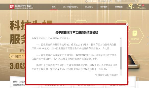 而民生信托方面则于3月30日发出了一封说明,称部分媒体对民生财富旗下基金的报道引用数据金额较大,但对具体投资情况表述模糊,指代不清。