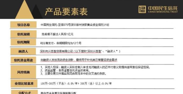 雷达财经注意到,还有自称是前民生财富理财师的网友在论坛中晒出了民生信托至信875号深圳新材贷款集合资金信托计划的产品要素。该网友称,这是民生信托专门给300万以下客户准备的信托产品,目前已经延期,民生信托提出展期半年。