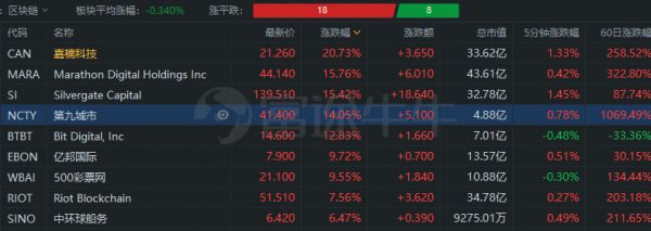 区块链部分个股走强,嘉楠科技大涨近21%,第九城市大涨14%