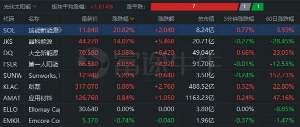 瑞能新能源涨超20%,$晶科能源(JKS.US)$涨14.07%,大全新能源涨13.55%。