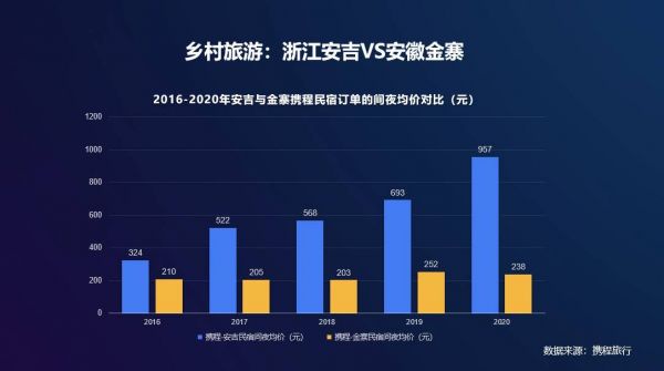 2016-2020年携程民宿订单 安吉与金寨间夜均价对比图(数据来源:携程旅行)