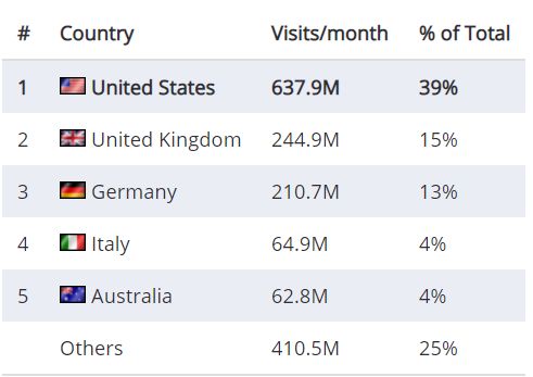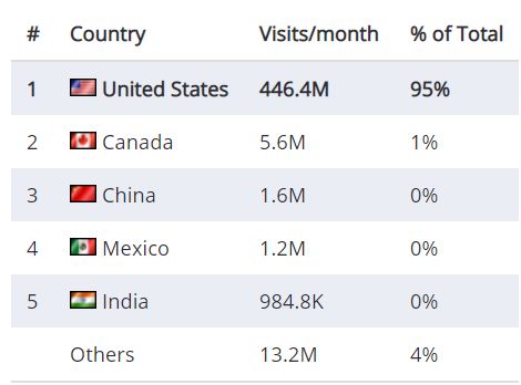 eBay在美国排名第2,月活量为6.4亿。eBay美国站占eBay全球流量的39%。据统计,eBay的全球GMV为900亿美元,假设营业额与流量水平成正比,美国GMV约为350亿美元。