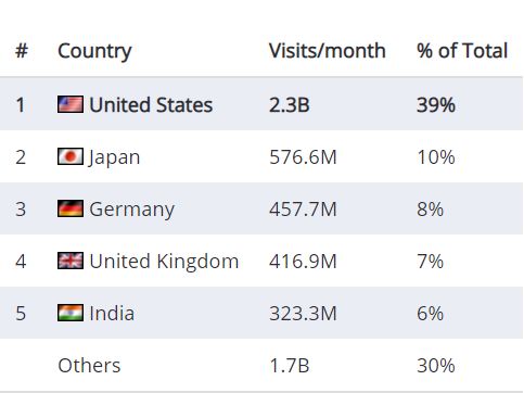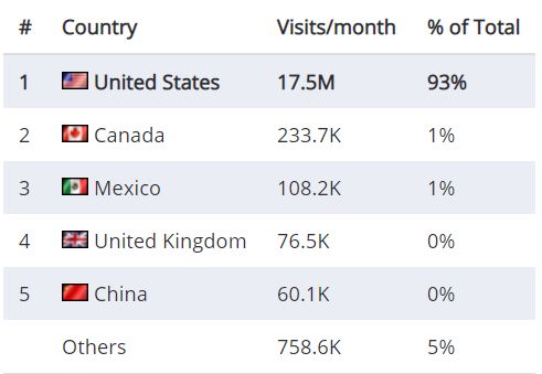 Wish是全球下载次数最多的购物app,全球GMV多达100亿美元,月活量1.12亿,全球排名第21位。Wish的国际受众纷繁多样,但美国是最大的流量端口,占比22%。