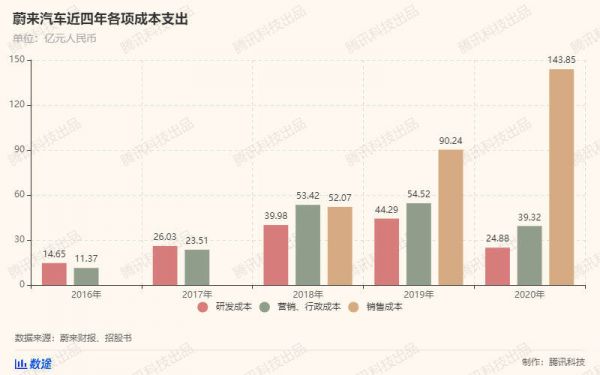 此外,在各项成本支出中,占比最重的是销售成本,尤其是当大规模交付正式开始之后。从上图可以看出,从2018年蔚来汽车正式交付开始,这一费用就高居不下,甚至在2020年超过了143亿元。