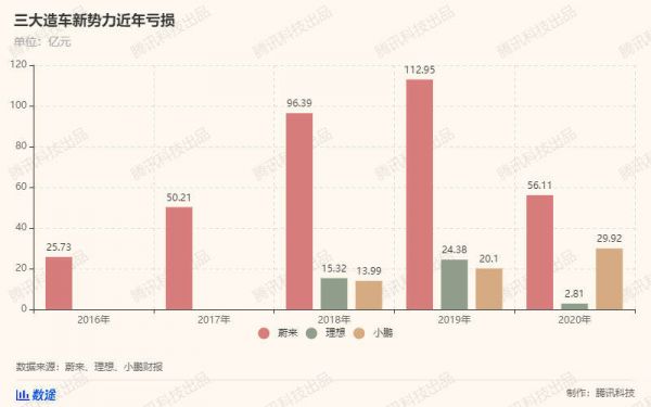 正因为如此,小米必须要做好持续亏损的心理准备,三家公司公布的数据显示,都没有实现盈利,蔚来近五年已经亏去了超过300亿元,最多的一年亏损超过了100亿元,小鹏、理想近三年的亏损总额分别超过了60亿元和40亿元。