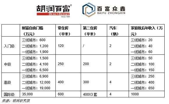 胡润研究院指出,中国三线城市入门级财富自由门槛是600万元,主要包括一套120平米的市区常住房、2辆车、20万元的家庭税后年收入和250万元的金融投资;中级财富自由门槛是1500万元,主要包括一套250平米的市区常住房、一套200平米的郊区第二住房、2辆车、50万元的家庭税后年收入和400万元的金融投资;高级财富自由门槛是6900万元,主要包括一套400平米的市区常住房、一套300平米的郊区第二住房、4辆车、250万元的家庭税后年收入和2500万元的金融投资。