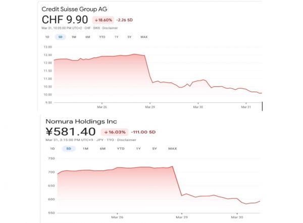 从周一至今天,野村股价累计下跌了16.3%,并在周一创下单日最大纪录跌幅,瑞士信贷累积下跌18.6%,创一年来最大跌幅。此外,摩根士丹利、瑞士银行、德意志银行也都全线下跌。