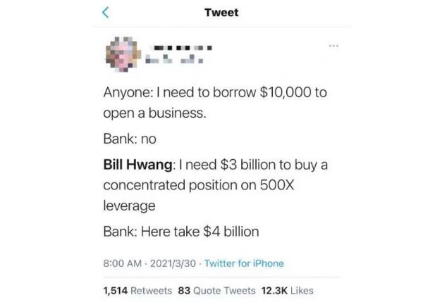 在Twitter上关于此事件有一个高赞贴,网友表示,任何人想找银行借1万美元开个小店,这些银行看都不看你一眼。但Bill Hwang说,我想借30亿美元来买加了500倍杠杆的集中头寸,银行们就前赴后继地向前送钱:40亿拿去!