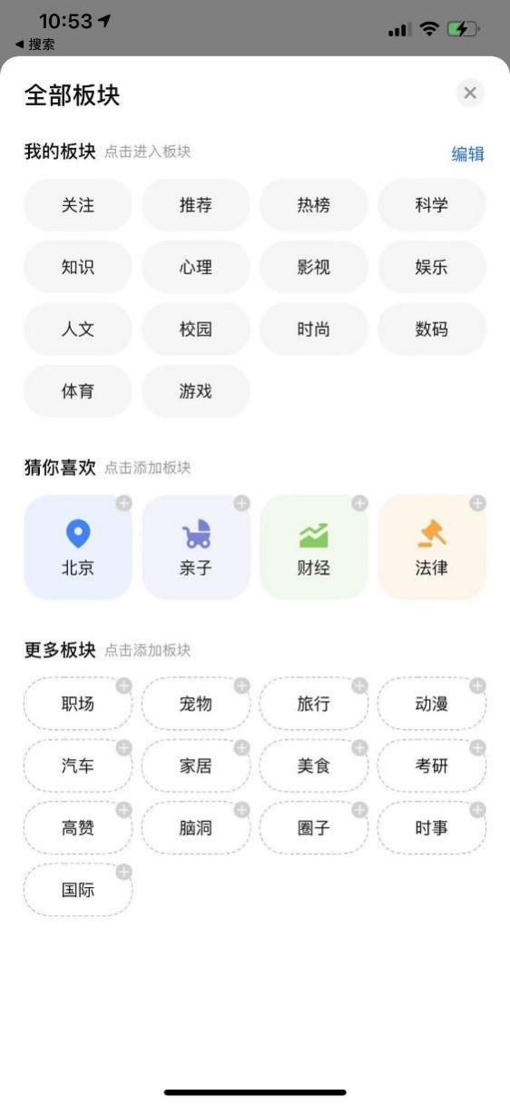 总体来看,多样化的内容供给可以帮助知乎吸引到更多的大众用户。而通过板块的划分可以将相似的用户集中于垂直板块,从而有助于垂直领域内社区氛围的维护。打开知乎APP,知乎的核心板块设置包括心理、科学、时尚、数码、体育、宠物、旅行、法律、财经等接近30个,各种类型的用户都能在知乎找到自己喜欢的内容,获得自己想要的答案。