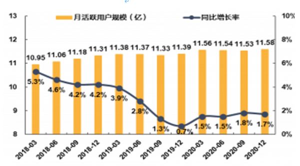 由于互联网竞争已进入下半场,用户增长恐难逃流量天花板。根据 QuestMobile 的数据,2020 年 Q1 中国移动互联网月均 MAU 为 11.50 亿,其中 3 月 MAU 11.56 亿,而 18 年同期 MAU 为 10.95 亿,2 年复合增速仅为 3.1%,全网用户量增速放缓,整体用户量趋于稳定。