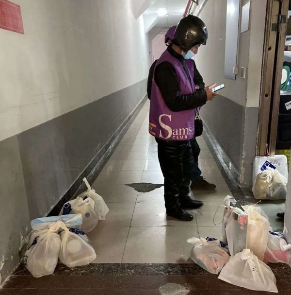 在普陀区交暨路某创业园区内,就有一家山姆会员商店云仓。一天下午,记者看到云仓外已停有五六辆配送小哥的电动车,上面印有京东到家或达达logo,而小哥们正在忙碌地将大包小包的订单从3楼搬下来。