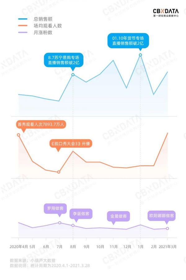 开播场次的提升,明显带动了销售成绩。根据小葫芦大数据,截至3月底,罗永浩直播间已开播超150场,销售额突破30亿,稳居抖音第一。