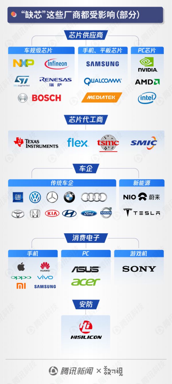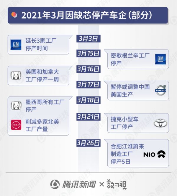 如果再将时间线拉长,已有十余家汽车制造商因芯片断供问题被迫减产甚至停产。