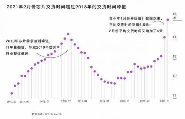 另据美国金融机构海纳国际集团 (Susquehanna Financial group)的数据显示,今年2月,芯片平均交货时间(即从下达订单到实际交货)已扩大至15个星期,为2017年开始数据收集以来最久纪录。作为芯片供应链的参与者、芯片行业晴雨表,博通公司的芯片交货时间现已从12.2周延长至22.2周。