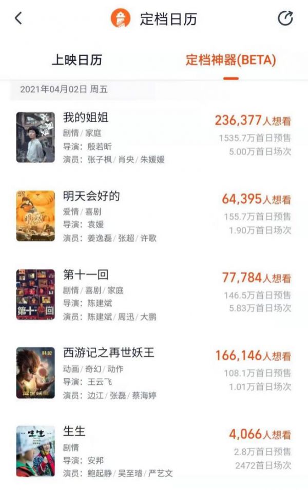 其中《第十一回》的观望情绪最重,根据猫眼数据,4.2影片还有20%的排片,到了4.3就变成了8.3%。而《我的姐姐》则是普遍看好的状态,上映首日以及第二日的黄金场次都超过了《哥斯拉大战金刚》。