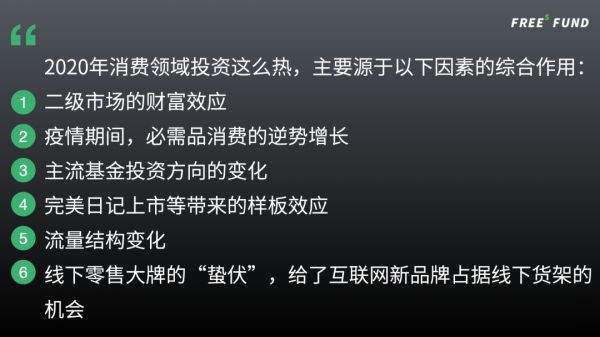 所以,鉴于上面六个方面的原因,我们看到2020年消费领域的投资是很火热的。那么新的问题来了——2021年会怎么样呢?