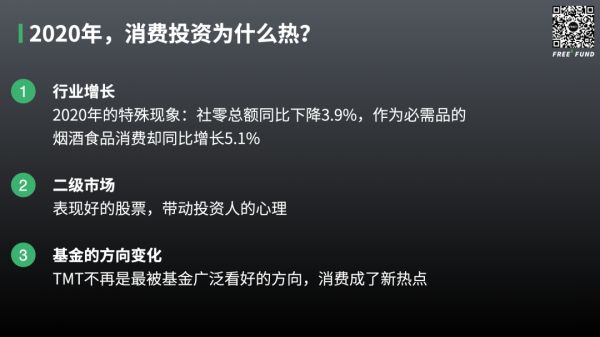 2020年消费领域这么热,主要源于以下因素的综合作用:二级市场中刚需消费品股票的良好表现、疫情期间必需品消费的逆势增长、主流基金投资方向的变化、完美日记上市等带来的样板效应、流量结构变化、线下零售大牌的“蛰伏”给了互联网新品牌占据线下货架的机会。