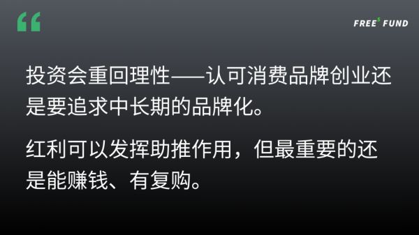 总体而言,投资会重回理性,认可消费品牌创业还是要追求中长期的品牌化,红利可以发挥助推作用,但最重要的还是能赚钱、有复购。