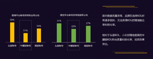 报告直言不讳地指出,在微博平台,头部账号的异常粉丝率高达58%,就连尾部账号异常粉丝都有54%,相比之下中腰部账号异常粉丝率最低,但也有51%。听起来很吓人吧,但要按业内经验,这数字可能还说低了……