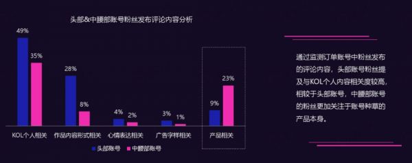 出现这种差别,一个原因是,中腰部账号通常是垂直类别,粉丝对账号呈现的内容(介绍的产品)更感兴趣,而不是对KOL本人。