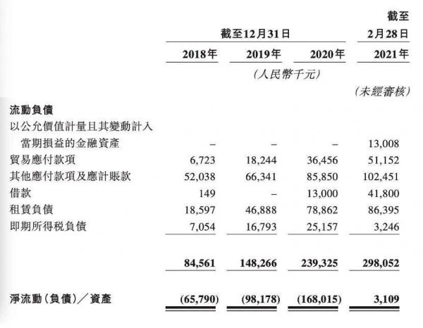 截至2018年、2019年、2020年末,海伦司的净流动负债分别为6580万元、9820万元、1.68亿元。而同期海伦司现金及现金等价物分别为1010万元、2230万元以及2430万元。