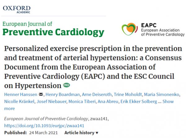 相关论文以 “Personalized exercise prescription in the prevention and treatment of arterial hypertension: a Consensus Document from the European Association of Preventive Cardiology (EAPC) and the ESC Council on Hypertension” 为题,于 3 月 24 日发表在《欧洲预防心脏病学杂志》(European Journal of Preventive Cardiology)上。、
