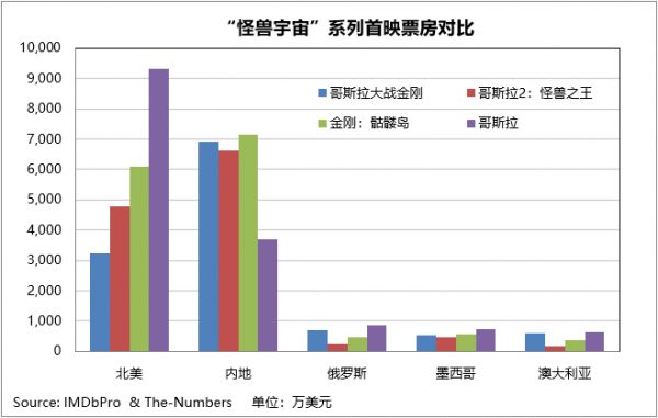 若进一步与“怪兽宇宙”的前作做对比,便能看出《哥斯拉大战金刚》对影院的拉动作用:在俄罗斯,《哥斯拉2:怪兽之王》和《金刚:骷髅岛》的首映数字分别为238万美元和481万美元,相当于《哥斯拉大战金刚》同期的34%和69%,而系列最高则为《哥斯拉》的863万美元。同时《哥斯拉大战金刚》在澳大利亚和墨西哥也高于前作,显示影片对当地观众的吸引力有增无减。