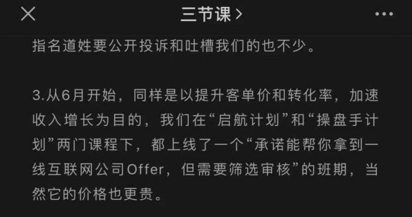 比如销售团队的快速扩建,导致三节课出现了“不管用户是否合适课程先卖出去再说”的心态,比如“就业推荐”的课程让不少用户体验不佳,比如激进地扩张让团队的组织开始不稳定等等。