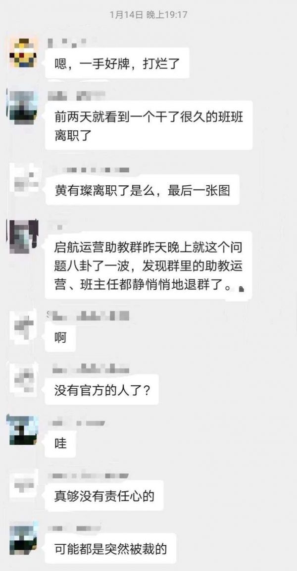 林晨发现,2021年1月,助教群里的正式员工全部退群了;年后,有学员想要报课,首页课程也下架了。不久,助教群里就丢出了一个惊天炸雷,“黄有璨对赌失败,引咎辞职”。