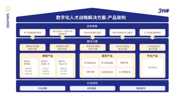 三节课做什么呢?“解决方案”的提供商。简言之,有关数字化的问题,三节课都解决。公司不懂怎么转型?我来;公司需要培训,我来;公司需要声势,我还可以来。