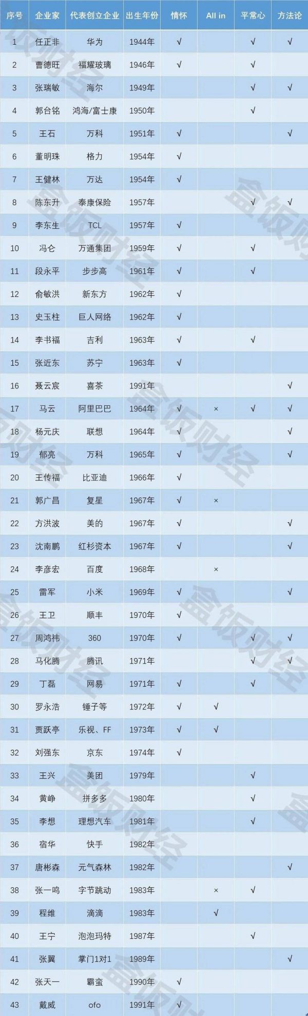 从采访、公开演讲、内部信等公开信息中,我们搜集整理了50后、60后、70后、80后、90后的数百位知名企业家,从中逐一查找筛选,找到了具有典型代表意义的四十余位企业家。