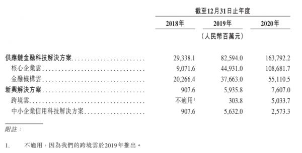 通过蚂蚁集团2020年招股书中披露的信息,其微贷科技业务中小微经营者信贷余额为4200亿元,其中网商银行贡献了一千多亿元的信贷余额,不过招股书中并没有任何数据能够具体到供应链金融的口径上。但根据灼识咨询的数据,2020年蚂蚁集团的供应链金融服务资产规模为1580亿元,略逊于联易融的1640亿元。