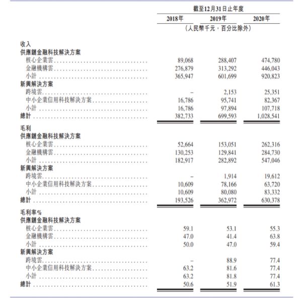 联易融的具体业务类别分为供应链金融科技解决方案和新兴解决方案,从对应业务促成的融资额度上,这两块业务的比重分别为95.6%和4.4%;从收入角度看,这两者的比重分别为89.5%和10.5%;在毛利上,这两者的权重分别为86.8%和13.2%。