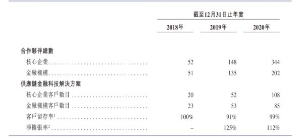 随着合作金融机构的扩大,联易融也能够将登记的供应链资产直接出售给合作金融机构,同样达到快速回笼企业资金的效果。2018年至2020年,核心企业云促成的供应链资产交易规模呈倍数增长,这表明主营业务的增长动力十分强劲。