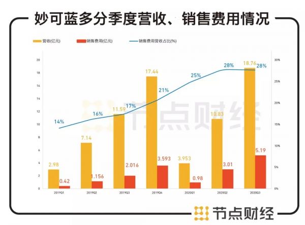 2019年,妙可蓝多的净利率在1%-2%之间,2020年净利率在3%左右徘徊。此外,妙可蓝多的销售费用高企,2020年每一季度都能占到营收的近30%,我们也可以看出妙可蓝多的营收增加幅度远不及销售费用上涨幅度。