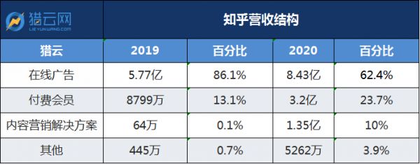 在线广告依旧占据知乎营收的大半壁江山,由2019年的5.77亿元增至8.43亿元,但占总营收比由86.1%下降至62.4%。