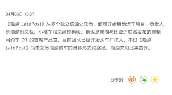 滴滴虽未对消息置评,但八九不离十,早前传出小米造车消息时,反映也是暧昧不明,没过多久雷军就当众承认了小米造车消息。
