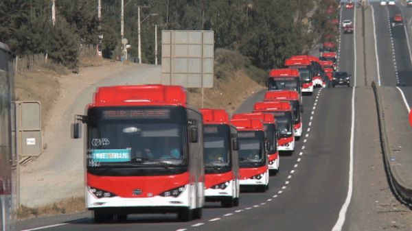 ▲比亚迪100台纯电动大巴车队行驶在圣地亚哥