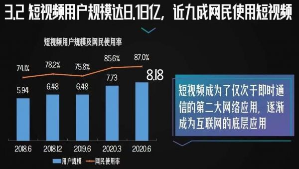 《2020中国网络视听发展研究报告》显示,2018年下半年,短视频应用的日均使用时长超综合视频应用,成为网络视听应用领域之首; 截至2020年6月,短视频用户规模达8.18亿,近九成网民使用短视频。短视频以人均单日110分钟的使用时长超越了即时通讯。 同时,在网络视听产业中,短视频的市场规模占比最高,达1302.4亿,同比增长178.8%。短视频还在向电商、直播、教育等多元领域不断渗透,影响力持续深入,推动网络视听行业格局的变化。