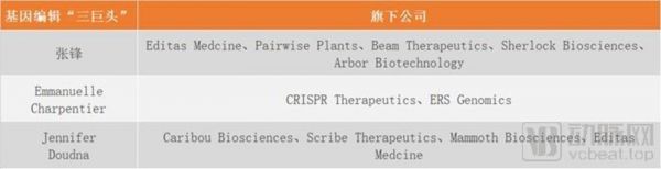 对基因编辑领域有所好奇的朋友一定对“基因编辑三巨头”都有所耳闻。他们分别是华裔生物学家张锋、法国科学家Emmanuelle Charpentier、美国科学家Jennifer Doudna。张锋和Jennifer Doudna利用CRISPR/ Cas专利技术率先创办了Editas,Emmanuelle Charpentier则创办了CRISPR Therapeutics。