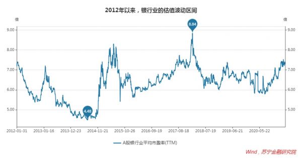 自2012年以来,银行业的估值在一个相对固定的区间波动,最低为4.48倍,最高为8.84倍。最低点出现在2014年,当时受经济增速下行、贸易融资乱象、不良压力、互联网金融冲击等多重因素影响,市场对银行业极度悲观。但自2015年以来,银行平均估值已很少低于6倍,表明恐慌成为过去。当前,市场将银行业视作中规中矩的周期行业,既谈不上悲观,也谈不上乐观。