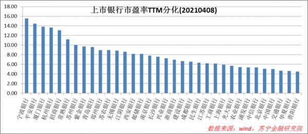 从当前上市银行的估值分布来看,低至4.52倍,高至15.57倍,分化很明显,但差距仍在合理范围内。如宁波银行以15.57倍市盈率拔得头筹,在银行业内部是佼佼者,但相比沪深300指数(19倍)、创业板指数(49倍),估值水平处于低位,并没有突破银行业的估值框架。
