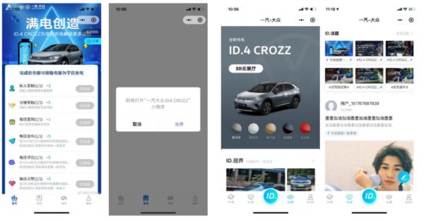 除了节目中的标版、中插、片尾鸣谢、花字、跑马灯等硬广以外,今年一汽-大众以“满电创造”小程序开始了饭圈打投的营销玩法。在小程序上,用户进行会员注册、签到以及邀请好友都会得到用来为创造营学员们“充电”的“电量”。一汽-大众则会为三期榜单的前三名提供相应的资源,包括《ELlemEN睿士》杂志大片、全国九个城市户外广告曝光和决赛日腾讯视频的开屏广告。